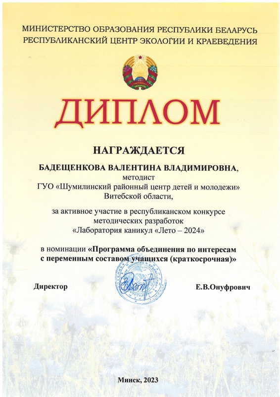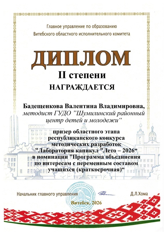 общественная деятельность: является заместителем председателя профсоюзного комитета ГУДО "Шумилинский РЦДиМ"