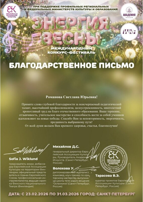 Решением Шумилинского районного исполнительного комитета от 17.04.2023 г. "За достижение наилучших показателей по итогам работы за 2022 год" занесена на Доску почёта Шумилинского района в номинации работников социальной сферы РОМАНОВА СВЕТЛАНА ЮРЬЕВНА педагог дополнительного образования ГУДО "Шумилинский районный центр детей и молодёжи"